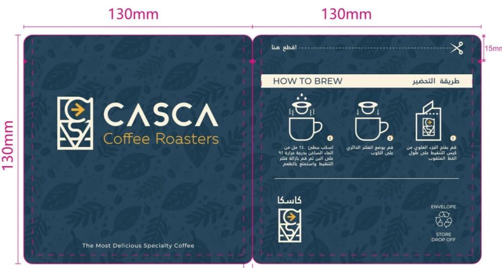 يحتوي الظرف على فلتر بتقنية ورق الترشيح المخفف وبداخله قهوة مختصة مطحونة مغلفة بإحكام.